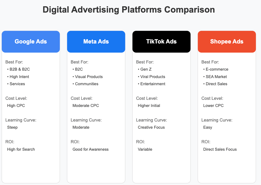Dalam emel kali ini, saya nak kongsikan tentang apa perbezaan platform ads (Google, Tiktok, Meta dan Shopee) dan mana satu yang berbaloi untuk guna?