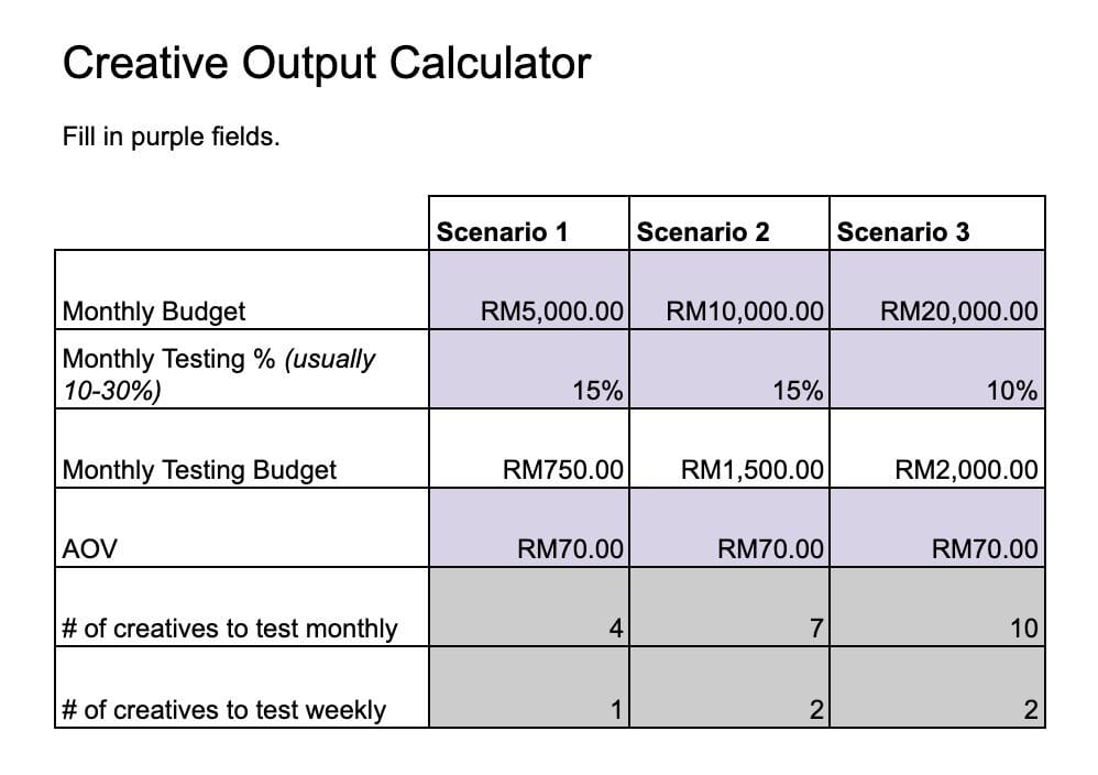 Boleh kira dekat Spreadsheet 👉 Creative Testing Output Calculator
